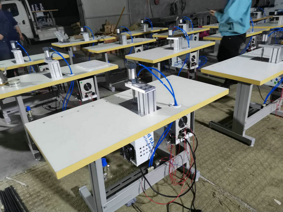本機(jī)以超聲波將綁帶融合于口罩本體兩側(cè),進(jìn)而完成綁帶式口罩成品,只需一名操作員將口罩片置于超聲波發(fā)生器的頭上,后將綁帶放在口罩片上,腳踏踏板使氣缸向下運(yùn)動,縫住綁帶和口罩片。
